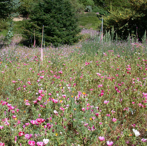 A closer look at the Clarkia amoena field which is finishing its bloom.
